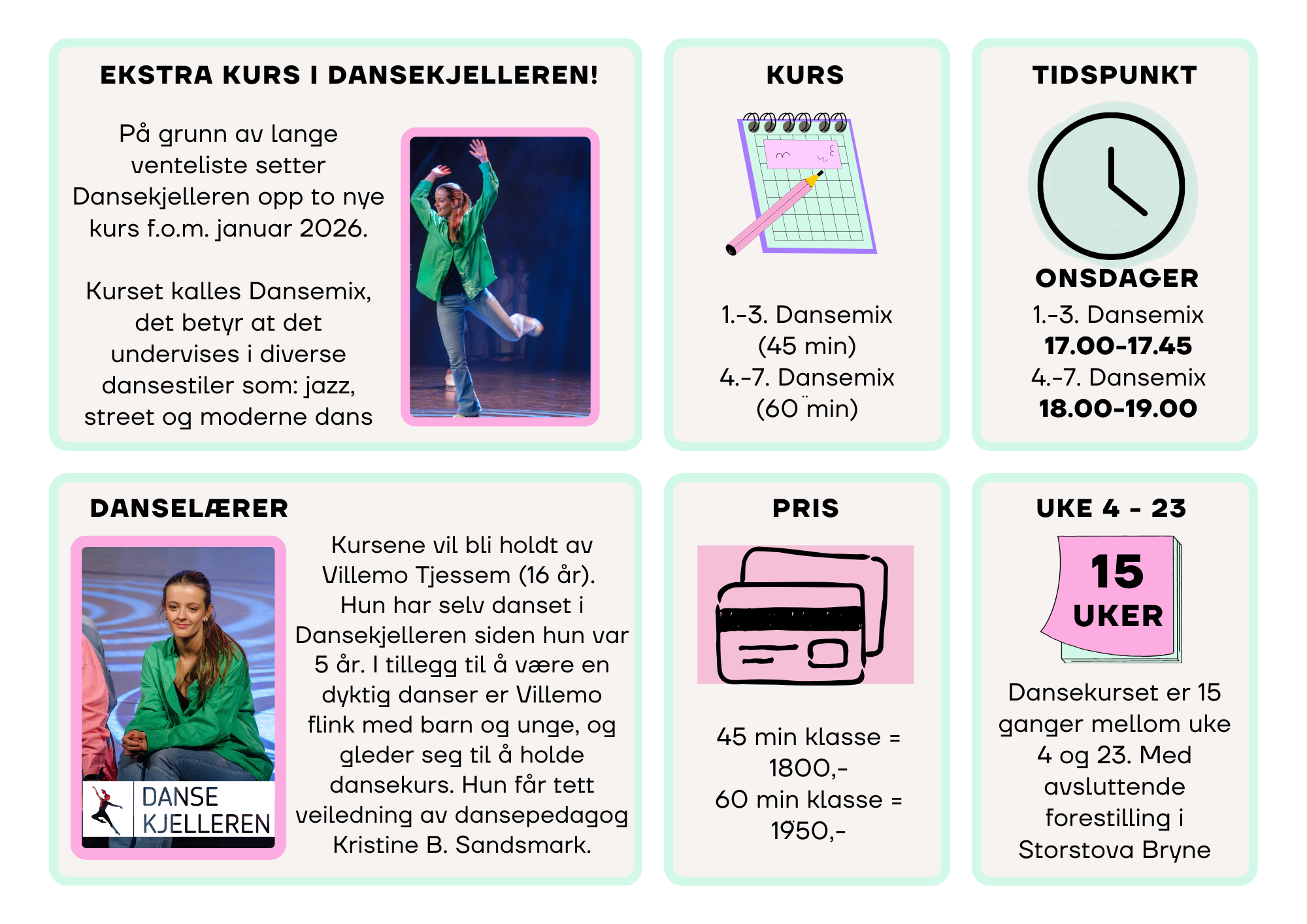 Velkommen til Dansekjelleren! Vårsemester 2026 starter uke 4. Vi har satt opp ekstra kurs på våre to mest populære alderstrinn: 1.-3. og 4.-7.